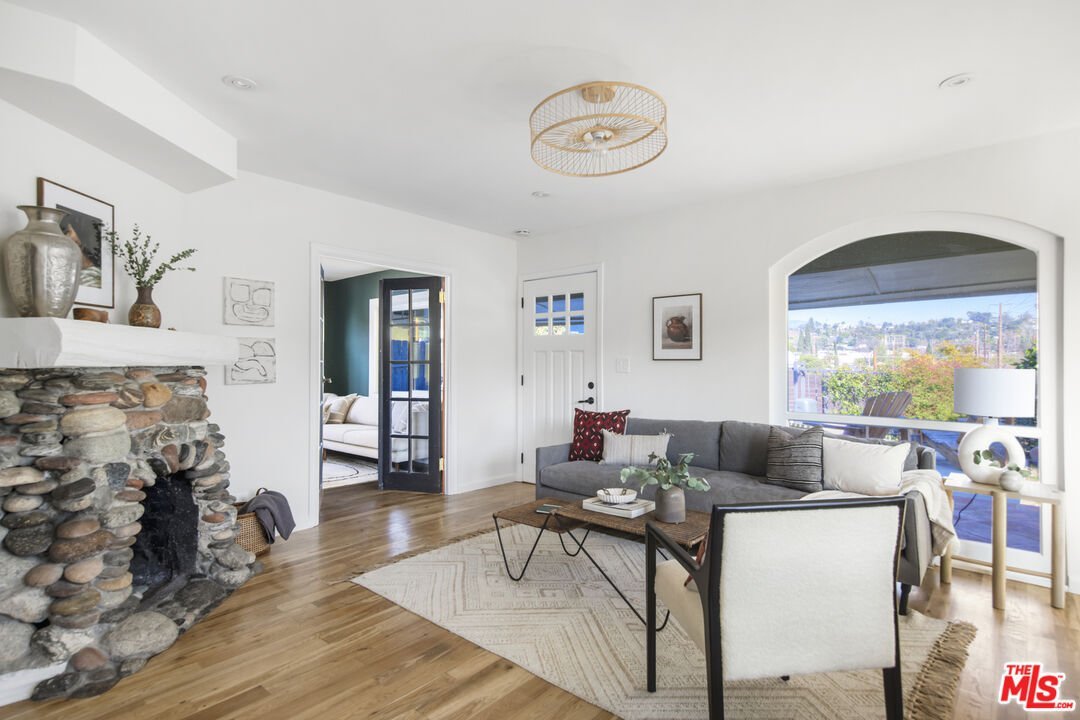 Nestled on a hilltop in the heart of Eagle Rock, behind a wall featuring a mural commissioned by Evelyn Leigh (artist behind Swan Stairway), this stunning Craftsman Bungalow has a blend of vintage elegance and modern convenience. Originally built in 1911 and gated from the street, it boasts 2 bedrooms and a den and 1 1/2 bathrooms. With an open floor plan, the living and dining areas are spacious and flow seamlessly into the kitchen. Upstairs is the primary suite with a sitting area and covered porch with lovely views of the San Gabriel mountains. The garden contains plantings that were selected specifically for a Mediterranean climate and include lemons, blood oranges, grapefruits, figs, olives, grapes, rosemary, pomegranates, jasmine, and avocado.